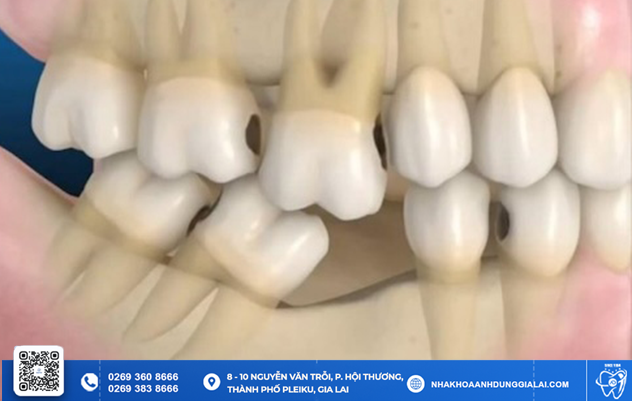 Khi mất răng cửa, chiếc răng đối diện không còn lực nâng đỡ nên có xu hướng mọc trồi lên hoặc tụt xuống, gây mất cân đối trong hàm. Đồng thời, các răng bên cạnh cũng có thể xô lệch về khoảng trống mất răng – tình trạng này còn được gọi là hiệu ứng Domino. Về lâu dài, sự dịch chuyển này làm mất khớp cắn chuẩn, gây khó khăn trong ăn nhai và có thể dẫn đến rối loạn khớp thái dương hàm.